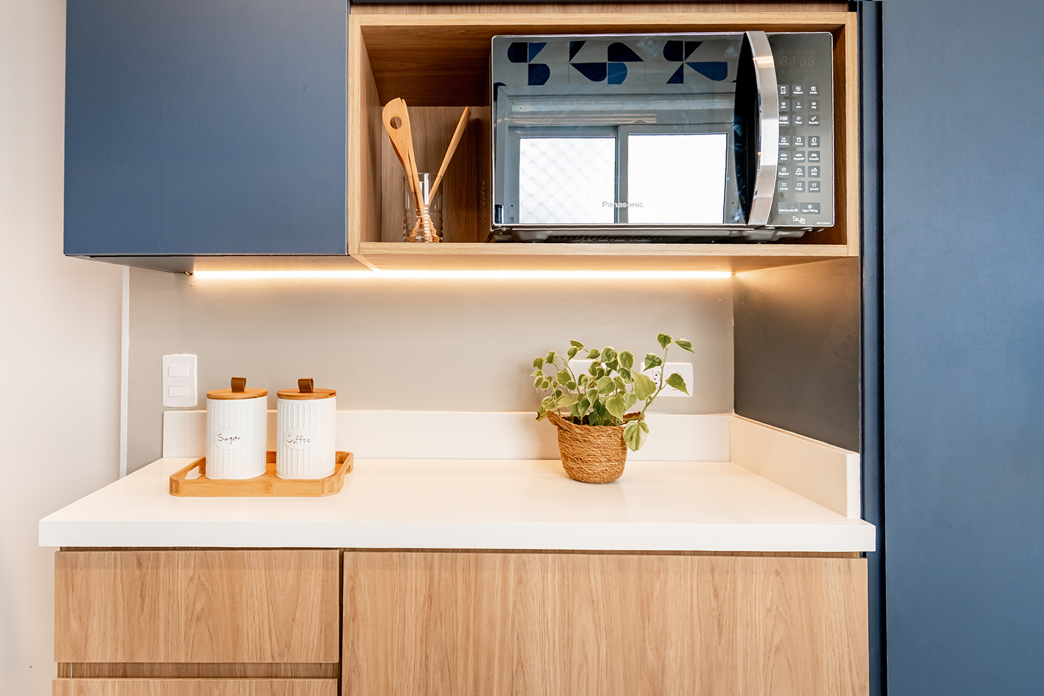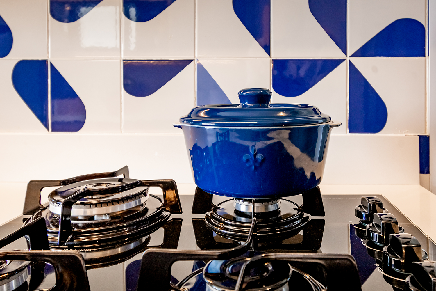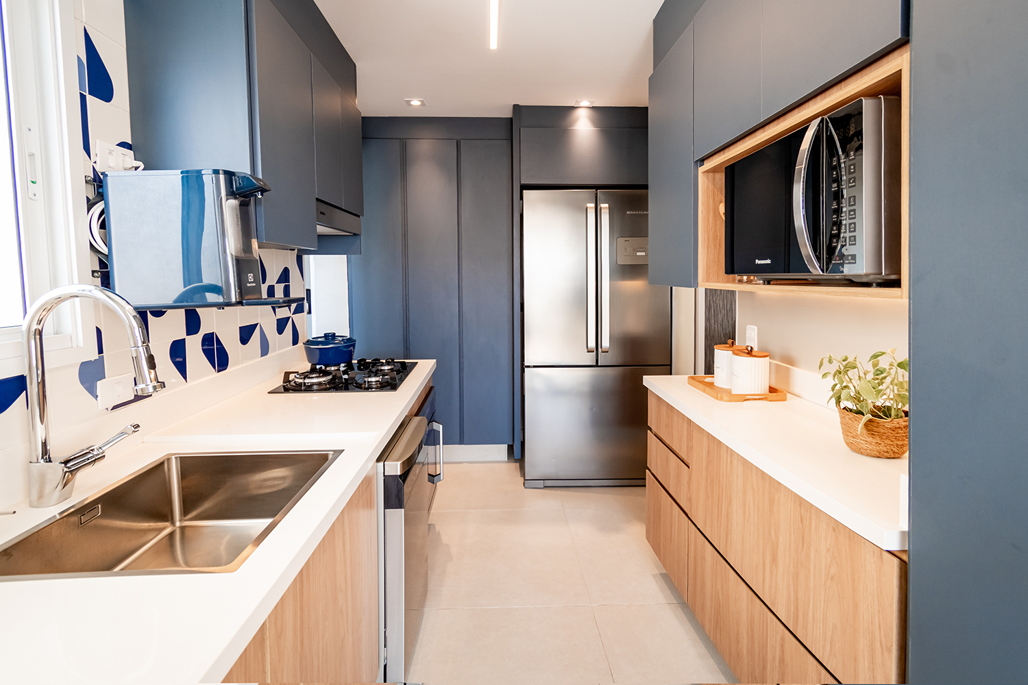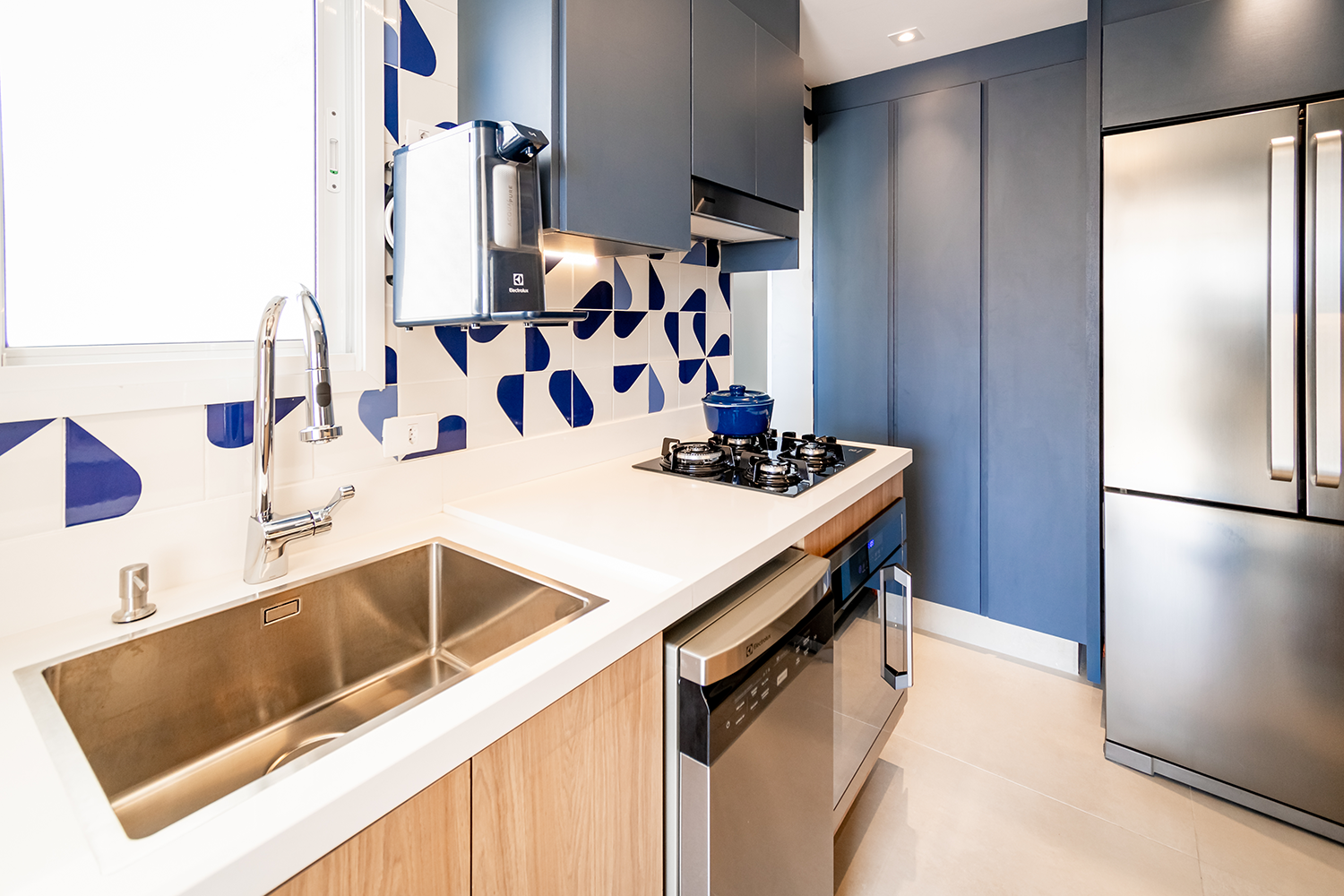 Na cozinha o conceito foi baseado nos tons de azul, branco e madeira. Todo o projeto de marcenaria, marmoraria e revestimentos foi pensado atendendo às necessidades dos clientes para trazer funcionalidade e praticidade.