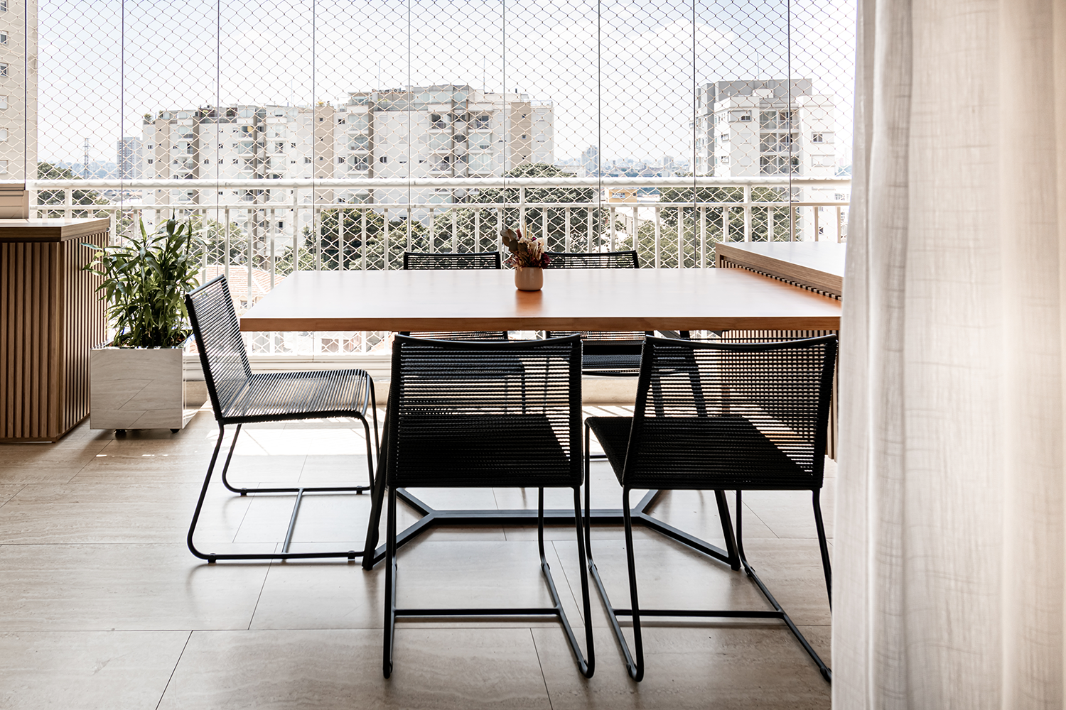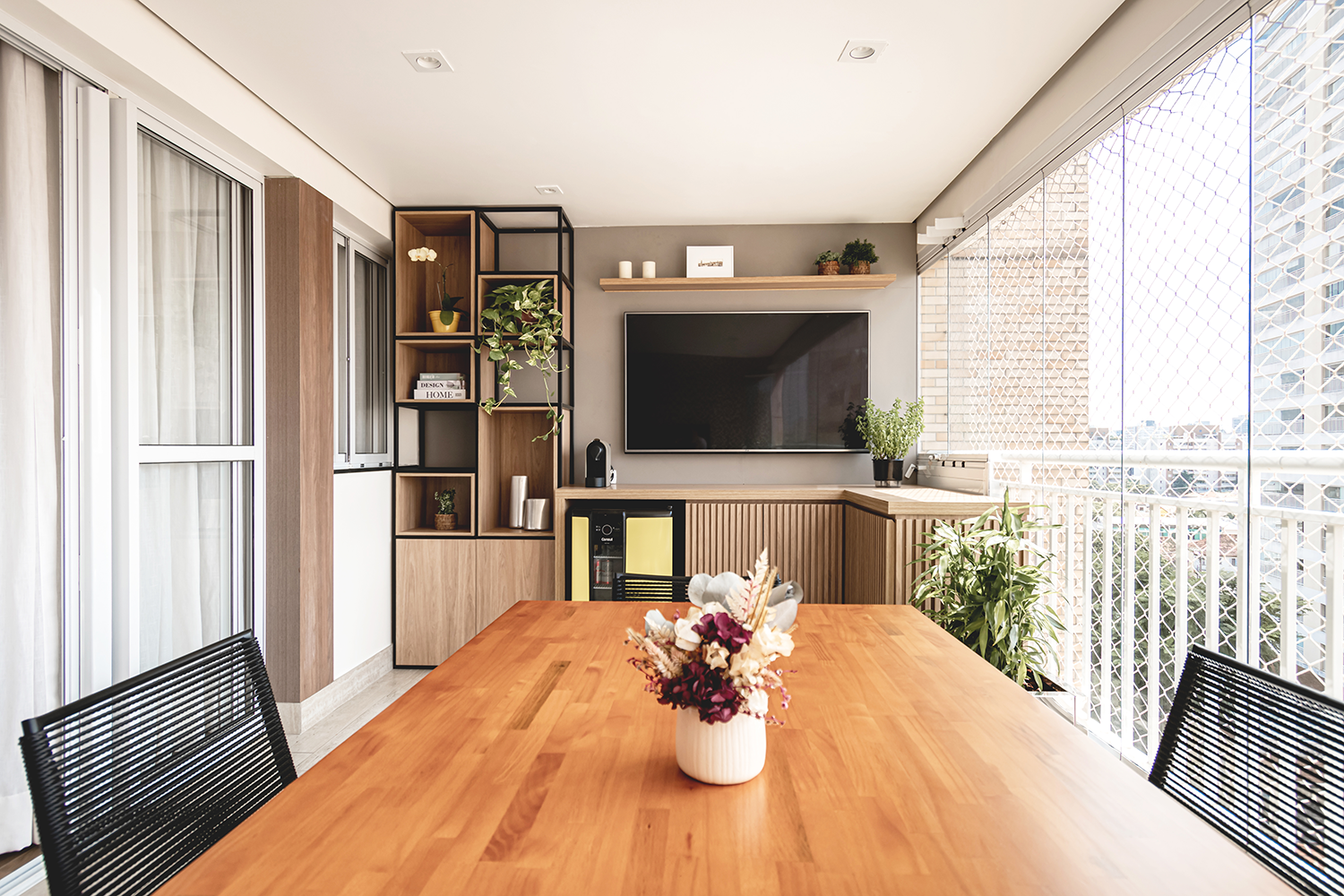 Na varanda criamos um espaço aconchegante e charmoso adequando tudo para o melhor uso da família.